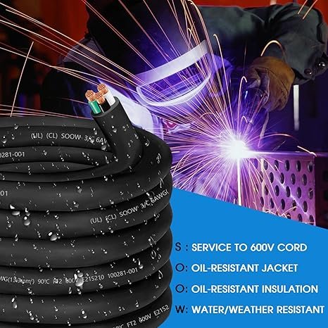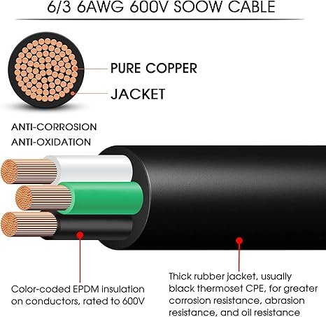 - Safe 6 AWG SOOW portable power cable: The 6 gauge 3 conductor OFC wire (OFC-Oxygen Free Copper) meets UL standards (UL E1215210), provides greater electrical conductivity, and the 600V SOOW electrical cable cord wire rating without overheating or damaging electric 6/3 SOOW cable for ensuring safety and durability in all situations.