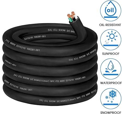 - Water and oil resistant: The 600V 6 AWG SOOW bulk wire 6/3 6 Gauge 3 conductor SOOW electric wire (SOOW-Service, Oil, and Water Resistant) is designed to withstand harsh conditions, perfect for industrial/outdoor/commercial use,including NEMA 14-50 welder machine/power generator/RV outlet box/electric car charger/fryer/dryer.