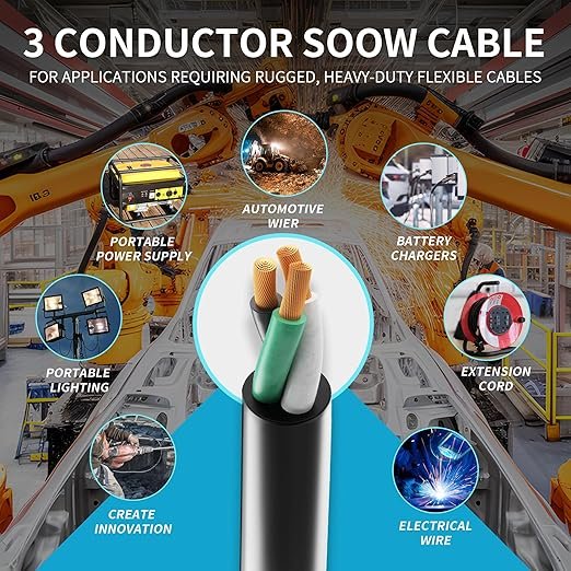 • Versatile Applications: SOOW electrical wire is widely employed in industrial settings; as well as outdoor and marine applications; Thanks to its rubber insulation and jacket; this cable is well-suited for environments where exposure to these elements is common; Typical applications include power generation, mining operations, oil and gas exploration; Construction Equipment and Power Extension Cord