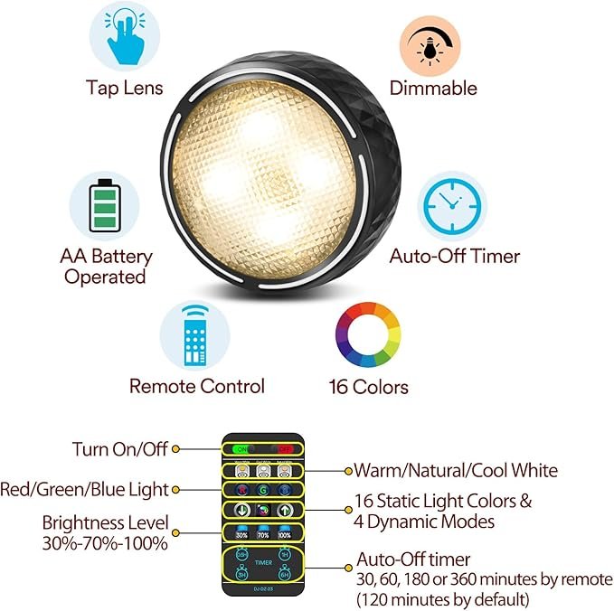 - Tap & Remote Control: Short press the front cover to turn on & change color, long press to turn off. Use the remote to customize your favorite light color among 16 static colors and 4 dynamic modes, quick set brightness level to 30%, 70%, 100%